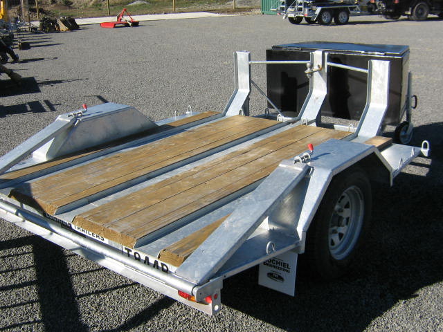 This smaller trailer has a set of ramps attached and three separate runners to transport trail motorbikes. It is also useful for transporting lawn mowers, quad bikes, or small plant-like rotary hoes and spray tanks. It has a jockey wheel to assist in an easy load/unload off the tow ball. There is also a toolbox in the front to carry any loose gear such as helmets, protective gear, strops, etc…